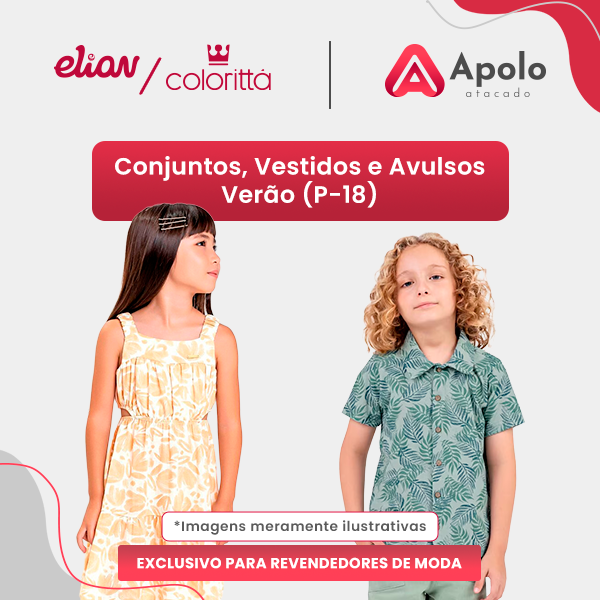 Aposte na Elian e Colorittá num mix perfeito de peças com modelos lindos e estilosos de conjuntos (20%), Vestidos (19%) e Avulsos (61%)! Imagine sua lucratividade com ao quilo saindo a R$ 180,00 cada. Grade: P ao 18 - Distribuídos em: 6% do P ao G, 34% 1-3, 35% 4-8 e 25% 10-18. Com 59% Eliane 41% Colorittá. Os modelos apresentam mix de peças regatas, blusas, camisetas, shorts, bermudas, saias e vestidos. Vendido em kits com média de 9 quilos - saindo em média R$ 1.620,00 , perfeito para montar kits e combos na sua Loja!