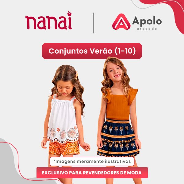 Lançamento Imperdível!! Kit de conjuntos Nanai com 15 peças saind0o a R$ 79,90 cada conjunto! Um kit apaixonante por suas cores, estampas e modelagens - deixe sua loja ainda mais bonita com os kits Nanai. Moda premium com qualidade superior e design que são a cara do nosso verão tropical. O kit conta com 15 peças distribuídos em: 40% 1-3 47% 4-8 13% 10-12